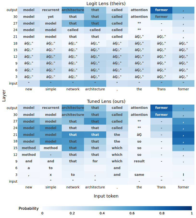 A team led by Nora Belrose developed the tuned lens technique to interpret activations at each layer of a transformer as being about predictions of the next token. This can be easily applied to a variety of models to achieve a coarse-grained understanding of the model, such as which layers implement a given behavior (like induction heads that copy from the input stream).